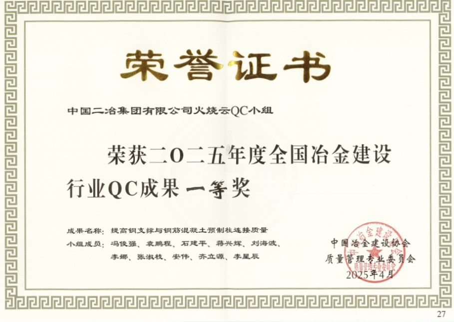 2025年4月,冶金分公司新疆火燒云QC小組憑借創(chuàng)新成果《提高鋼支撐與鋼筋混凝土預(yù)制柱連接質(zhì)量》榮獲2025年度全國冶金建設(shè)行業(yè)QC一等獎(jiǎng)。這一成果不僅提高了鋼支撐與鋼筋混凝土預(yù)制柱連接一次驗(yàn)收合格率,還為新疆火燒云項(xiàng)目的技術(shù)升級(jí)提供了示范性解決方案,展現(xiàn)了中國二冶冶金分公司的技術(shù)創(chuàng)新實(shí)力。