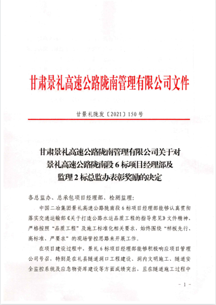 近日,甘肅分公司景禮項目部在甘肅景禮高速公路隴南管理有限公司組織的“四新技術”、“微創改”推廣應用、“品質工程”及施工標準化建設等檢查評比中名列前茅,項目管理公司對景禮項目部進行通報表揚,并給予獎勵40萬元。
