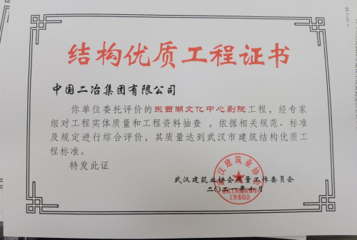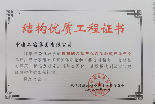 10月16日,由中國(guó)二冶承建的武漢東西湖文化中心項(xiàng)目文化創(chuàng)意產(chǎn)業(yè)中心及劇院主體結(jié)構(gòu)完成驗(yàn)收,并獲武漢市優(yōu)質(zhì)結(jié)構(gòu)工程獎(jiǎng)。
