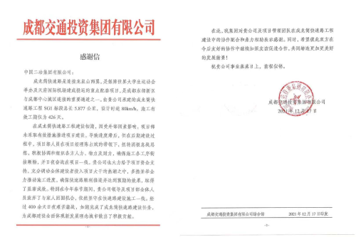 12月17日,成都交通投資集團有限公司致中國二冶表揚信,對中國二冶四川分公司在成龍簡快速路工程項目施工建設中,攻堅克難、頑強奮戰,優質、安全、高效地完成施工建設任務,順利實現快速路主體工程全線貫通給予表揚。