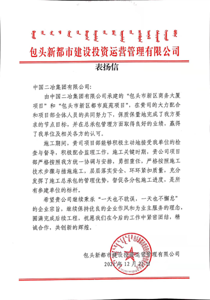 12月21日,包頭新都市建設(shè)投資運(yùn)營(yíng)管理有限公司致中國(guó)二冶表?yè)P(yáng)信。衷心感謝中國(guó)二冶各級(jí)領(lǐng)導(dǎo)和全體員工的共同努力,保質(zhì)保量完成包頭市新都市區(qū)商務(wù)大廈、新都市區(qū)都市庭苑項(xiàng)目各項(xiàng)網(wǎng)絡(luò)節(jié)點(diǎn)目標(biāo),取得良好業(yè)績(jī),贏得各方的稱(chēng)贊和認(rèn)可。