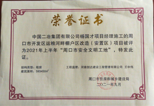 12月27日,中國二冶周口市運糧河畔棚戶區改造(安置區)項目獲評2021年“周口市安全文明標準化工地”。