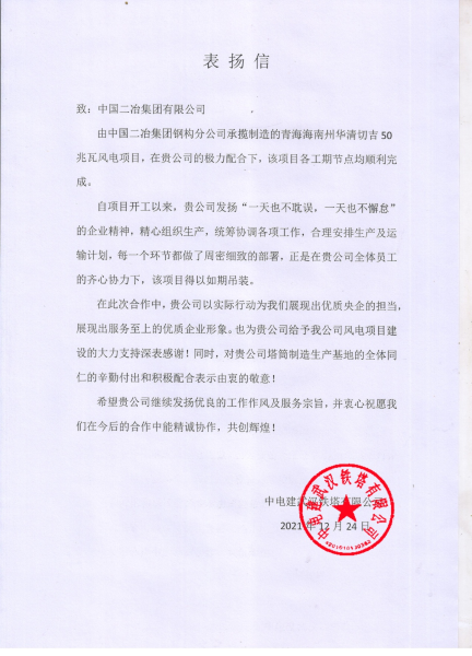 12月24日,中電建武漢鐵塔有限公司給中國二冶發(fā)來表揚信,贊譽其在青海海南州華清切吉50兆瓦風電項目中所表現(xiàn)出的優(yōu)秀管理水平和優(yōu)良的履約能力。