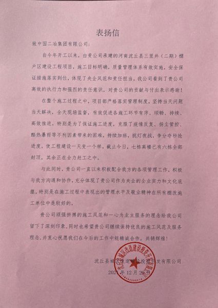 12月29日,沈丘縣城區(qū)改造建設投資開發(fā)有限公司向中國二冶發(fā)來表揚信,對中國二冶各級領導給予工程高度重視和大力支持表示衷心感謝,對該項目自開工建設以來,項目部全體人員所付出的努力和艱辛給予肯定和表揚。