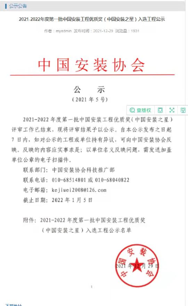 12月29日,中國安裝協(xié)會(huì)公布了2021--2022年度第一批中國安裝工程優(yōu)質(zhì)獎(jiǎng)(中國安裝之星)獎(jiǎng)。中國二冶內(nèi)蒙古達(dá)拉特旗90萬噸/年鋁板帶項(xiàng)目獲得(中國安裝之星)獎(jiǎng)。