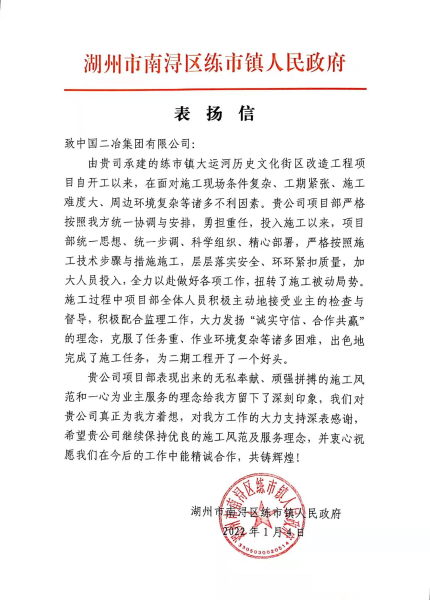 1月4日,湖州市南潯區(qū)練市鎮(zhèn)人民政府致中國二冶表揚(yáng)信,對中國二冶路橋分公司大運(yùn)河項(xiàng)目部無私奉獻(xiàn)、頑強(qiáng)拼搏的施工風(fēng)范和一心為業(yè)主服務(wù)的理念表示感謝。