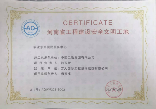 1月23日,從河南省工程建設協(xié)會傳來喜訊,中國二冶承建的河南鄭州農(nóng)業(yè)東路便民服務中心項目榮獲河南省2021年度“工程建設安全文明工地”稱號。