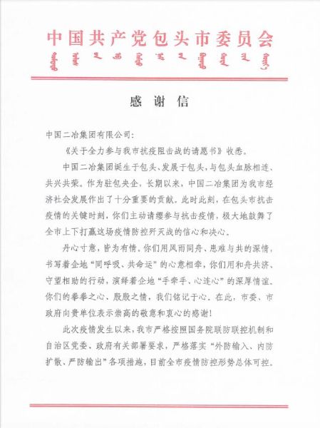 3月2日,中國二冶收到包頭市委、市政府發(fā)來的感謝信,感謝中國二冶在包頭市抗擊疫情的關(guān)鍵時刻,主動請纓,與包頭全體市民風(fēng)雨同舟、患難與共,為打贏這場疫情防控殲滅戰(zhàn)貢獻(xiàn)央企力量。