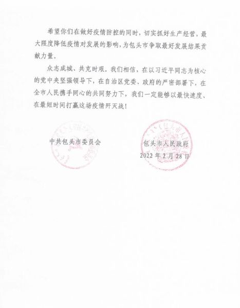 丹心寸意,皆為有情。中國二冶用風(fēng)雨同舟、患難與共的深情,書寫著企地“同呼吸、共命運”的心意相牽;用同舟共濟(jì)、守望相助的行動,演繹著企地“手牽手、心連心”的深厚情誼。希望中國二冶在做好疫情防控的同時,切實抓好生產(chǎn)經(jīng)營,最大限度降低疫情對發(fā)展的影響,為包頭市爭取最好發(fā)展結(jié)果貢獻(xiàn)力量。
