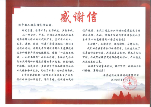 4月8日和12日,中國二冶連續收到內蒙古默銳能源材料有限公司的兩封感謝信,盛贊中國二冶在默銳一期項目建設中,突破工期緊任務重等不利因素,高標準嚴要求,精益求精匠心智造,披荊斬棘打造樣板工程,優質快速完成工程建設任務,充分彰顯冶金建設國家隊的央企責任和擔當。