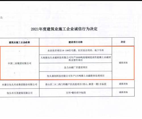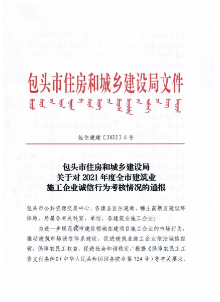 4月17日,中國(guó)二冶收到包頭市住房和城鄉(xiāng)建設(shè)局發(fā)布的《包頭市住房和城鄉(xiāng)建設(shè)局關(guān)于對(duì)2021年度全市建筑業(yè)施工企業(yè)誠(chéng)信行為考核情況的通報(bào)》,對(duì)中國(guó)二冶在建筑市場(chǎng)的誠(chéng)信行為予以表?yè)P(yáng)。