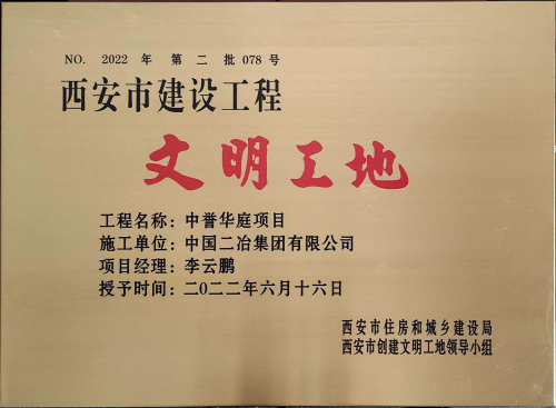 7月5日,中國二冶收到西安市住房和城鄉建設局頒發的榮譽證書及獎牌,由中國二冶承建的中譽華庭項目榮獲西安市“文明工地”榮譽稱號。