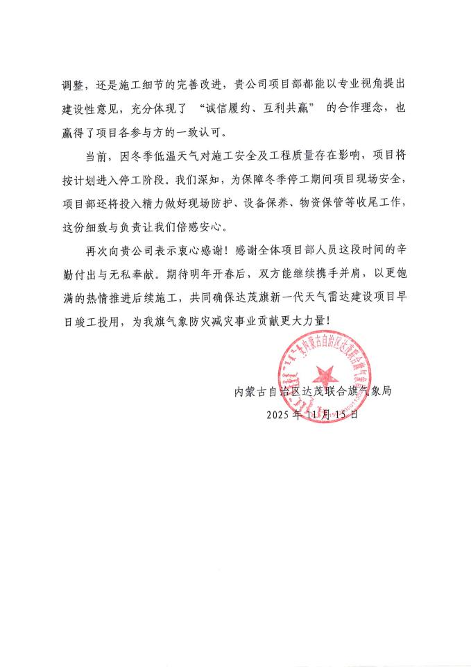 合作期間,項(xiàng)目部始終秉持開(kāi)放協(xié)作態(tài)度,與氣象局、監(jiān)理單位及設(shè)計(jì)單位建立高效溝通機(jī)制,及時(shí)反饋施工進(jìn)展,主動(dòng)協(xié)調(diào)解決建設(shè)中的各類問(wèn)題。同時(shí),在技術(shù)方案優(yōu)化、施工細(xì)節(jié)完善等方面積極提出建設(shè)性意見(jiàn),切實(shí)踐行 “誠(chéng)信履約、互利共贏” 的合作理念,贏得了項(xiàng)目各參與方的一致認(rèn)可。針對(duì)冬季低溫天氣對(duì)施工安全及工程質(zhì)量的影響,項(xiàng)目部還細(xì)致部署現(xiàn)場(chǎng)防護(hù)、設(shè)備保養(yǎng)、物資保管等冬季停工收尾工作,盡顯嚴(yán)謹(jǐn)負(fù)責(zé)的工作態(tài)度。 此次感謝信的送達(dá),極大鼓舞了項(xiàng)目部全體人員的士氣,既是對(duì)中國(guó)二冶高質(zhì)量管理與實(shí)干擔(dān)當(dāng)?shù)某浞终J(rèn)可,也為團(tuán)隊(duì)注入了強(qiáng)勁動(dòng)力。